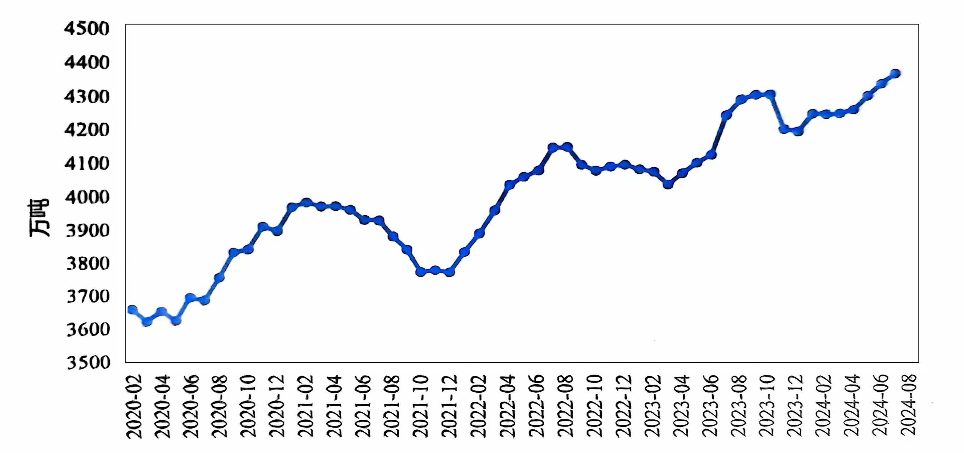 2024年9月,國內(nèi)電解鋁繼續(xù)保持穩(wěn)定生產(chǎn)。9月國內(nèi)電解鋁建成產(chǎn)能4462萬噸/年,運行產(chǎn)能4351萬噸/年,較上月增加5萬噸/年,為四川啟明星技改項目順利完畢。9月份產(chǎn)量為360萬噸,環(huán)比下降3.1%,同比增長1.8%,日均產(chǎn)量12.0萬噸,環(huán)比增長0.1%。