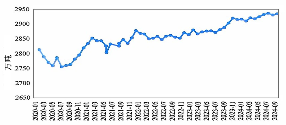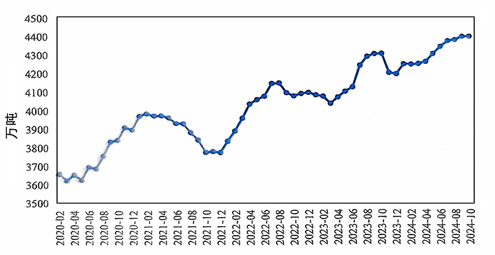 2024年10月,國內(nèi)電解鋁繼續(xù)保持穩(wěn)定生產(chǎn)。10月國內(nèi)電解鋁建成產(chǎn)能4462萬噸/年,運行產(chǎn)能4363萬噸/年,較上月增加12萬噸/年,主要因為四川、貴州等地技改產(chǎn)能逐步復(fù)產(chǎn)及新疆置換項目啟槽。本月開工率約98%,為歷史新高。10月份產(chǎn)量為373萬噸,環(huán)比增長3.4%,同比增長2.1%,日均產(chǎn)量12.0萬噸,環(huán)比持平。
