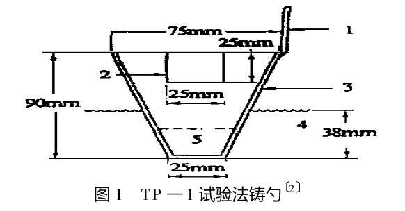 能保溫(718±5) ℃的 11kg 鋁的石墨坩堝電阻爐;標(biāo)準(zhǔn)合格的熱電偶;兩個錐形鑄勺或鑄模(圖1),內(nèi)側(cè)涂云母薄層外側(cè)噴石墨;鑄勺預(yù)熱(至316℃) 爐;計時器;石墨攪拌棒;簡易夾鉗;水冷卻槽(圖2) ;工作服和面罩等。