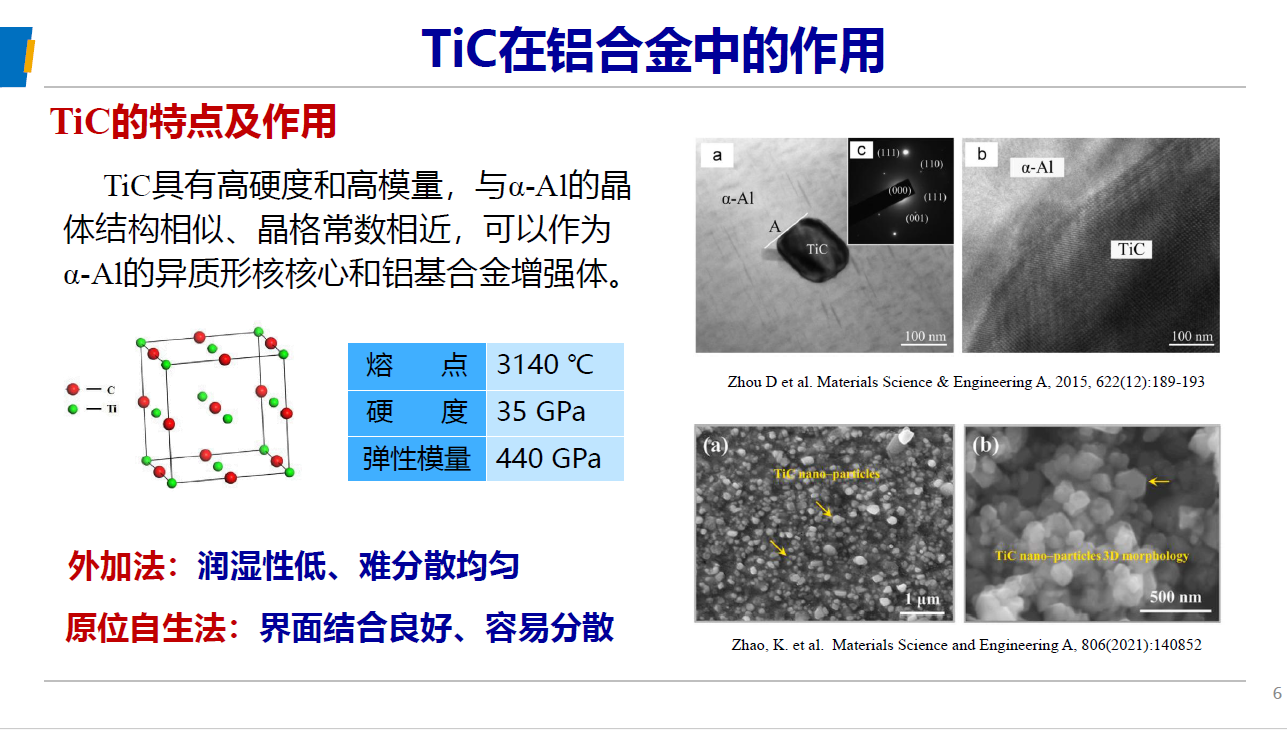新一代鋁鈦碳可以比較好的解決再生鋁保級、升級使用中的TiB2粒子問題,且細(xì)化能力不弱于、甚至超過鋁鈦硼,實(shí)現(xiàn)降本增效。它的TiC粒子的團(tuán)聚傾向遠(yuǎn)小于TiB2,反復(fù)重熔再生過程中TiC粒子形貌會不斷趨于完美,尺寸越來越小,雖基本喪失細(xì)化能力,但反而不影響正常細(xì)化劑的細(xì)化作用,達(dá)到納米級的TiC粒子還擁有增強(qiáng)鋁合金基體的作用。