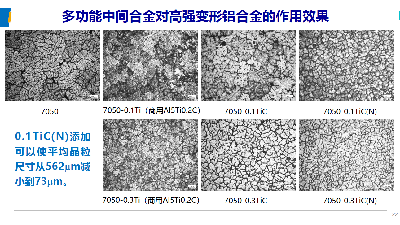 隨著新興的綠色鋁加工聚集區(qū)的建立,新的鋁加工熔鑄產(chǎn)能也隨著電解鋁產(chǎn)能的轉(zhuǎn)移而新興,整體鋁加工熔鑄產(chǎn)能持續(xù)擴(kuò)充,加劇了行業(yè)競爭的激烈程度,促動了整個鋁加工行業(yè)產(chǎn)品及技術(shù)的加速升級和進(jìn)步。本次峰會北京航空航天大學(xué)云南創(chuàng)新研究院肖文龍博士發(fā)表了題為“Al-TiC(N) 多功能中間合金的制備及應(yīng)用”的報告,首次系統(tǒng)性的展示了鋁基TiC增強(qiáng)復(fù)合材料,通過晶粒細(xì)化、復(fù)合強(qiáng)化、組織優(yōu)化等途徑,對于鋁合金基體的常溫、高溫力學(xué)性能的大幅提升。作為公司的戰(zhàn)略儲備技術(shù),我司峰越科技已開始6%TiC含量鋁基碳化鈦顆粒增強(qiáng)材料的工業(yè)化批量生產(chǎn),并成功應(yīng)用于6xxx系合金的強(qiáng)化、2219合金強(qiáng)化、7034焊絲以及增材制造材料的生產(chǎn)。