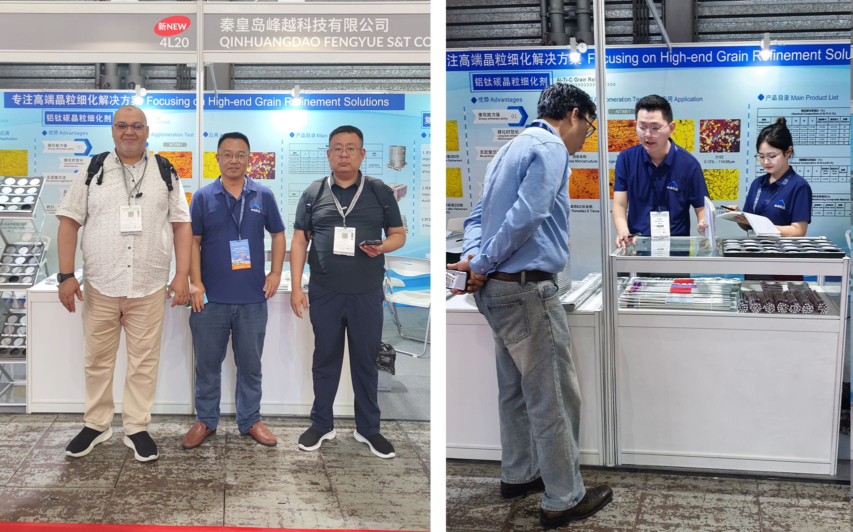 峰越科技此次重點展示了自主研發(fā)的鋁鑭硼(AlLa3B1.5)晶粒細化劑、6% TiC 顆粒增強復合材料和鋁鈦碳鈧(AlTi5C0.2Sc)晶粒細化劑。
